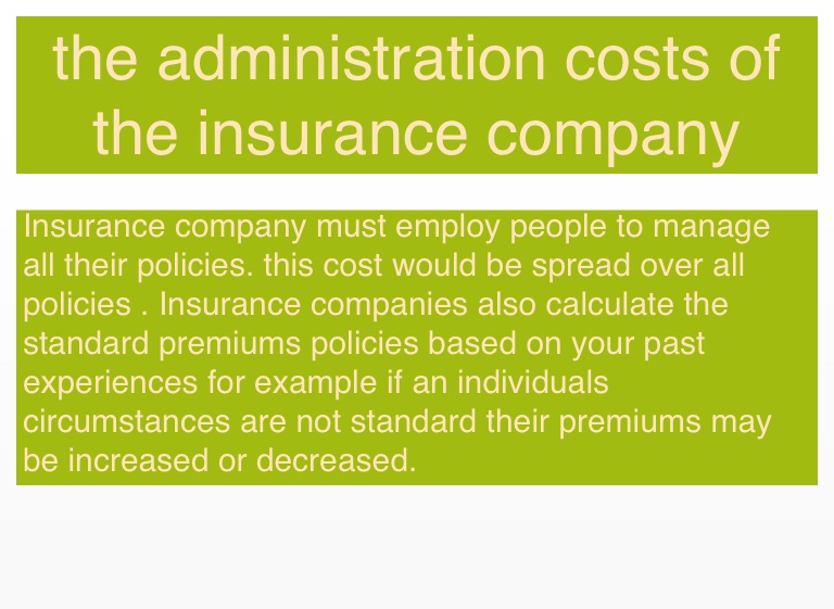 Insurance company must employ people to manage all their policies. this cost would be spread over all policies . Insurance companies also calculate the standard premiums policies based on your past experiences for example if an individuals circumstances are not standard their premiums may be increased or decreased.