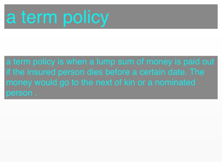 a term policy is when a lump sum of money is paid out if the insured person dies before a certain date. The money would go to the next of kin or a nominated person .