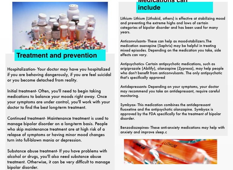 Anticonvulsants- These can help as mood-stabilizers.The medication asenapine (Saphris) may be helpful in treating mixed episodes. Depending on the medication you take, side effects can vary.