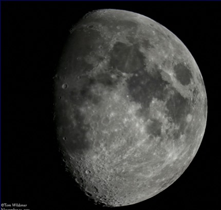 The waxing gibbous moon happens when the moon is between a 45 and 90 degree angle with respect to the Earth and Sun. So we are seeing more than half of the moon illuminated and less than half in shadow. The word gibbous refers to phases where the moon is more than half illuminated. “Waxing” essentially means growing or increasing in illumination. Each evening, as the moon’s orbital motion carries it towards the Earth-sun line, we see more of the moon’s day side.