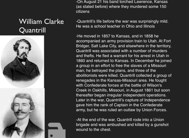 -At the end of the war, Quantrill rode into a Union brigade and was ambushed and killed by a gunshot wound to the chest.