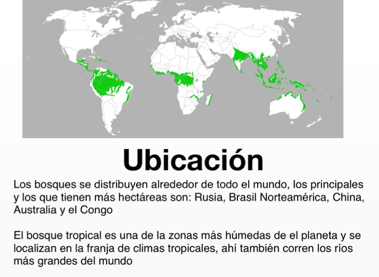 Los bosques se distribuyen alrededor de todo el mundo, los principales y los que tienen más hectáreas son: Rusia, Brasil Norteamérica, China, Australia y el Congo