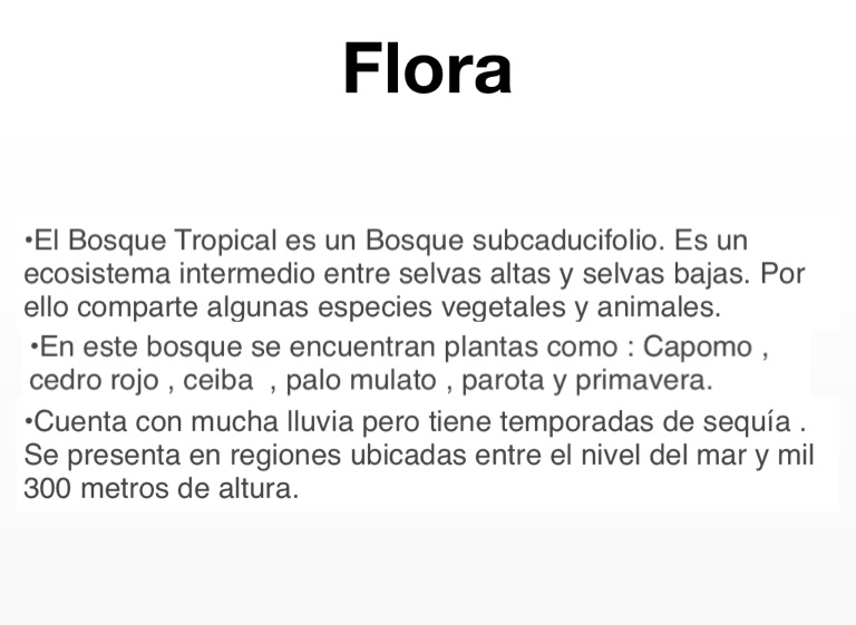 •El Bosque Tropical es un Bosque subcaducifolio. Es un ecosistema intermedio entre selvas altas y selvas bajas. Por ello comparte algunas especies vegetales y animales.