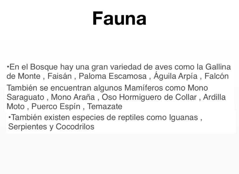 •También existen especies de reptiles como Iguanas , Serpientes y Cocodrilos