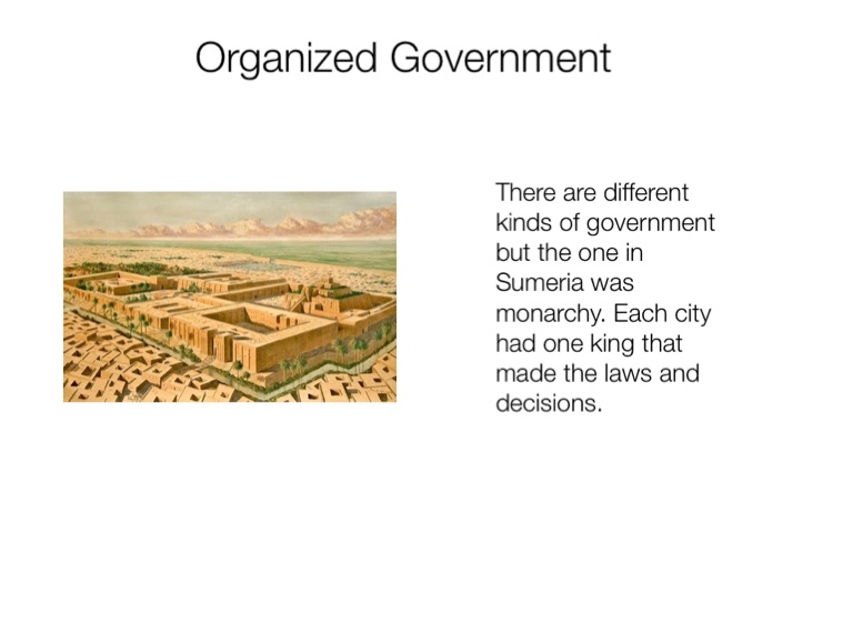 There are different kinds of government but the one in Sumeria was monarchy. Each city had one king that made the laws and decisions.