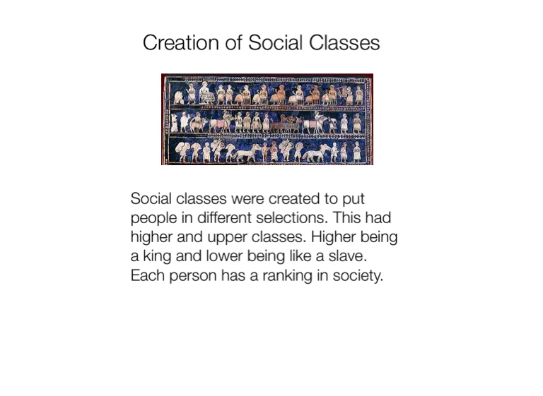 Social classes were created to put people in different selections. This had higher and upper classes. Higher being a king and lower being like a slave. Each person has a ranking in society.