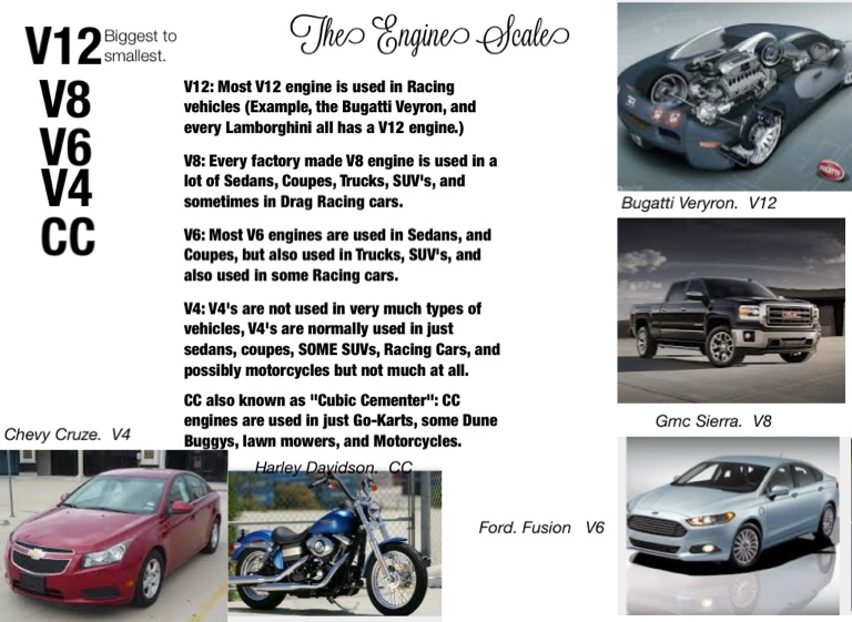 V12: Most V12 engine is used in Racing vehicles (Example, the Bugatti Veyron, and every Lamborghini all has a V12 engine.)