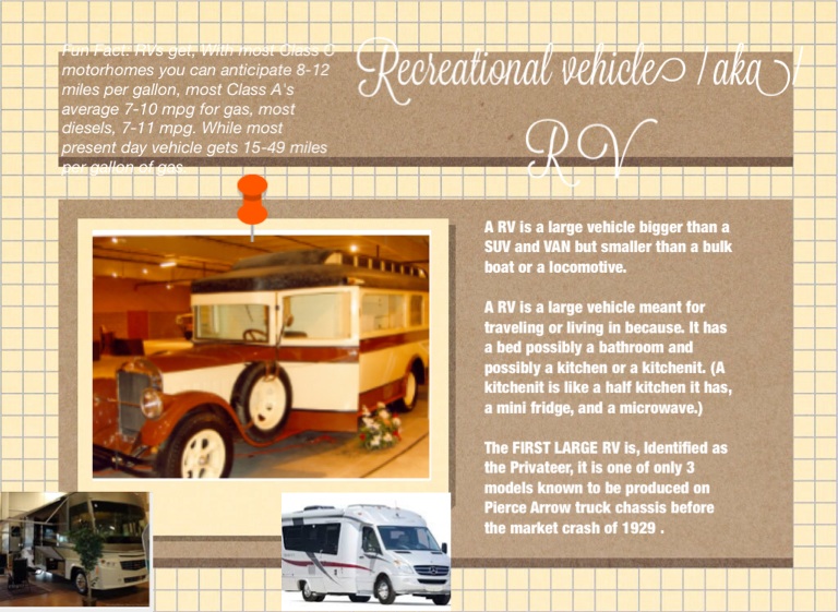 A RV is a large vehicle meant for traveling or living in because. It has a bed possibly a bathroom and possibly a kitchen or a kitchenit. (A kitchenit is like a half kitchen it has, a mini fridge, and a microwave.)