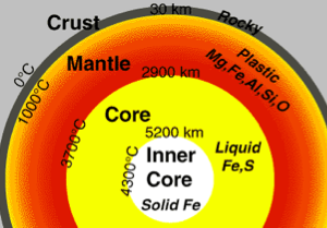 The mantle lays beneath the crust and is also divided into two parts: the upper and lower mantle. The upper mantle and the crust together form the lithosphere. The lithosphere is the weak spot in the upper mantle and is what causes the movement of tectonic plates and causes several activities upon the crust. The mantle has a depth of about 2,900 kilometers. The upper mantle has temperature ranging from 932 to 1,652°F and the lower mantle has a temperature of about 7,230°F. The most of Earth's mantle is NOT made up of magma! The Earth's lower mantle is actually made mainly of solid rock. This material is made up of silicon, oxygen, magnesium, iron, calcium, and aluminum.The upper mantle can move around like liquid but it is solid, this state of matter is called solid-plastic. Did you know that the lower mantle is mostly solid and not liquid!? The lower mantle is closest to the core and because of this, it hardens and becomes a rocky material. The Earth's lower mantle has a density between 3.4 to 4.3gm/cm3.