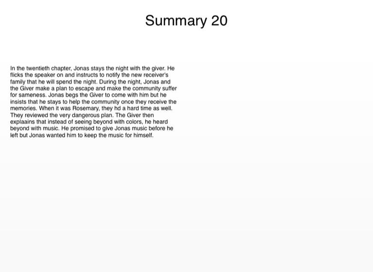 In the twentieth chapter, Jonas stays the night with the giver. He flicks the speaker on and instructs to notify the new receiver's family that he will spend the night. During the night, Jonas and the Giver make a plan to escape and make the community suffer for sameness. Jonas begs the Giver to come with him but he insists that he stays to help the community once they receive the memories. When it was Rosemary, they hd a hard time as well. They reviewed the very dangerous plan. The Giver then explaains that instead of seeing beyond with colors, he heard beyond with music. He promised to give Jonas music before he left but Jonas wanted him to keep the music for himself.