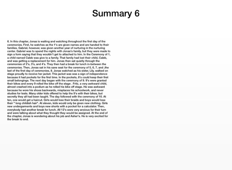 6. In this chapter, Jonas is waiting and watching throughout the first day of the ceremonies. First, he watches as the 1's are given names and are handed to their families. Gabriel, however, was given another year of nurturing in the nurturing center. Gabriel was to spend the nights with Jonas's family, but they were made to sign a form saying that they wouldn't get to attached to him. In the Ceremony of 1, a child named Caleb was give to a family. That family had lost their child, Caleb, and was getting a replacement for him. Jonas then sat quietly through the ceremonies of 2's, 3's, and 4's. They then had a break for lunch in-between the ceremonies. Then, Jonas sat in his sane seat for the ceremony of 5, 6, 7, and ,the last of the first day of ceremonies, 8. Jonas watched as his sister, Lily, walked on stage proudly to receive her jacket. This jacket was was a sign of independence because it had pockets for the first time. In the pockets, 8's could keep their first small belongings. The next day began with the ceremony of 9. 9's were granted their bikes and every 9 rolled the bike off the stage . Fritz, a very awkward child, almost crashed into a podium as he rolled his bike off stage. He was awkward because he wore his shoes backwards, misplaces his schoolwork, and never studies for tests. Many older kids offered to help the 9's with their bikes, but secretly they all had been taught. The day followed with the ceremony of 10. At ten, one would get a haircut. Girls would lose their braids and boys would lose their " long childish hair". At eleven, kids would only be given new clothing. Girls new undergarments and boys new shorts with a pocket for a calculator. Then, everybody had another break for lunch. All 12's were very anxious for their turn and were talking about what they thought they would be assigned. At the end of the chapter, Jonas is wondering about his job and Asher's. He is very excited for the break to end.