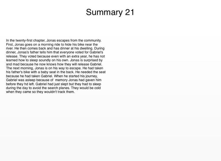 In the twenty-first chapter, Jonas escapes from the community. First, Jonas goes on a morning ride to hide his bike near the river. He then comes back and has dinner at his dwelling. During dinner, Jonas's father tells him that everyone voted for Gabriel's release. They voted because even with an extra year, he has not learned how to sleep soundly on his own. Jonas is surprised by and mad because he now knows how they will release Gabriel. The next morning, Jonas is on his way to escape. He had taken his father's bike with a baby seat in the back. He needed the seat because he had taken Gabriel. When he started his journey, Gabriel was asleep because of memory Jonas had gaven him before they hd left. Gabriel had just slept but they had to sleep during the day to avoid the search planes. They would be cold when they came so they wouldn't track them.