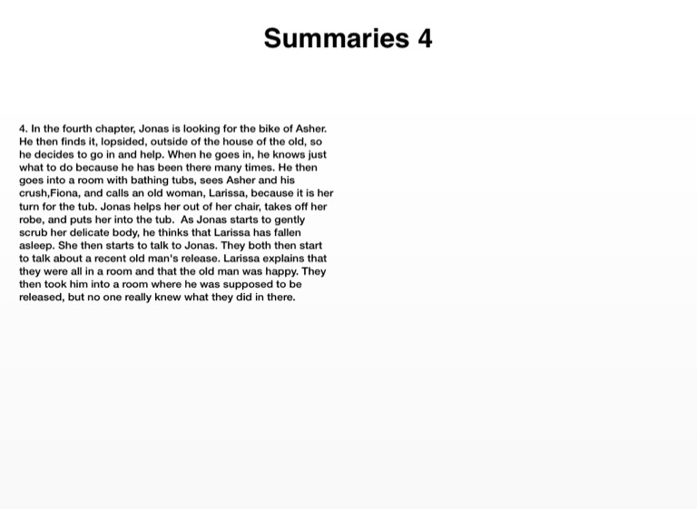 4. In the fourth chapter, Jonas is looking for the bike of Asher. He then finds it, lopsided, outside of the house of the old, so he decides to go in and help. When he goes in, he knows just what to do because he has been there many times. He then goes into a room with bathing tubs, sees Asher and his crush,Fiona, and calls an old woman, Larissa, because it is her turn for the tub. Jonas helps her out of her chair, takes off her robe, and puts her into the tub. As Jonas starts to gently scrub her delicate body, he thinks that Larissa has fallen asleep. She then starts to talk to Jonas. They both then start to talk about a recent old man's release. Larissa explains that they were all in a room and that the old man was happy. They then took him into a room where he was supposed to be released, but no one really knew what they did in there.