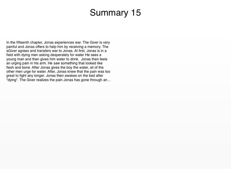 In the fifteenth chapter, Jonas experiences war. The Giver is very painful and Jonas offers to help him by receiving a memory. The aGiver agrees and transfers war to Jonas. At first, Jonas is in a field with dying men asking desperately for water He sees a young man and then gives him water to drink. Jonas then feels an urging pain in his arm. He saw something that looked like flesh and bone. After Jonas gives the boy the water, all of the other men urge for water. After, Jonas knew that the pain was too great to fight any longer. Jonas then awakes on the bed after "dying". The Giver realizes the pain Jonas has gone through and apologizes.
