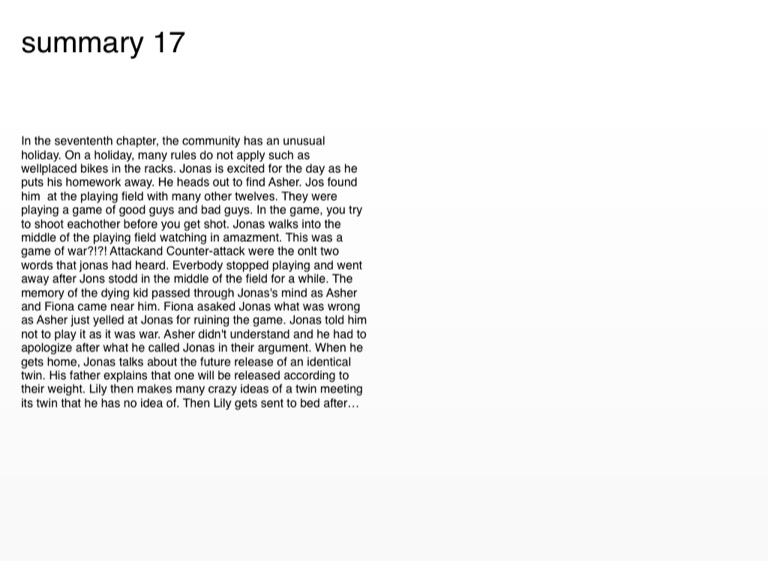 In the sevententh chapter, the community has an unusual holiday. On a holiday, many rules do not apply such as wellplaced bikes in the racks. Jonas is excited for the day as he puts his homework away. He heads out to find Asher. Jos found him at the playing field with many other twelves. They were playing a game of good guys and bad guys. In the game, you try to shoot eachother before you get shot. Jonas walks into the middle of the playing field watching in amazment. This was a game of war?!?! Attackand Counter-attack were the onlt two words that jonas had heard. Everbody stopped playing and went away after Jons stodd in the middle of the field for a while. The memory of the dying kid passed through Jonas's mind as Asher and Fiona came near him. Fiona asaked Jonas what was wrong as Asher just yelled at Jonas for ruining the game. Jonas told him not to play it as it was war. Asher didn't understand and he had to apologize after what he called Jonas in their argument. When he gets home, Jonas talks about the future release of an identical twin. His father explains that one will be released according to their weight. Lily then makes many crazy ideas of a twin meeting its twin that he has no idea of. Then Lily gets sent to bed after her crazy ideas.