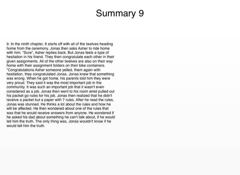 9. In the ninth chapter, It starts off with all of the twelves heading home from the ceremony. Jonas then asks Asher to ride home with him. "Sure", Asher replies back. But Jonas feels a type of hesitation in his friend. They then congratulate each other in their given assignments. All of the other twelves are also on their way home with their assignment folders on their bike containers. "Congratulations Asher someone yelled, them again with hesitation, they congratulated Jonas. Jonas knew that something was wrong. When he got home, his parents told him they were very proud. They said it was the most important job in the community. It was such an important job that it wasn't even considered as a job. Jonas then went to his room amid pulled out his packet go rules for his job. Jonas then realized that he didn't receive a packet but a paper with 7 rules. After he read the rules, Jonas was stunned. He thinks a lot about the rules and how he will be affected. He then wondered about one of the rules that was that he would receive answers from anyone. He wondered if he asked his dad about something he can't talk about, if he would tell him the truth. The only thing was, Jonas wouldn't know if he would tell him the truth.