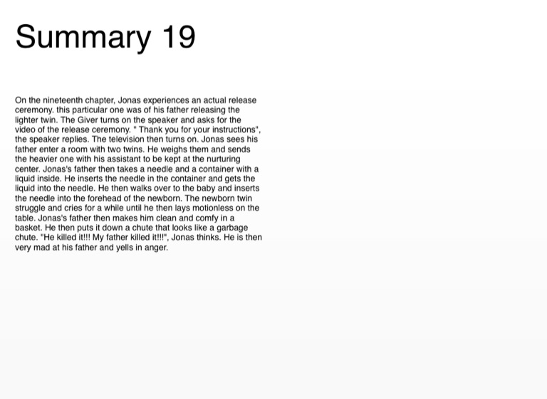 On the nineteenth chapter, Jonas experiences an actual release ceremony. this particular one was of his father releasing the lighter twin. The Giver turns on the speaker and asks for the video of the release ceremony. " Thank you for your instructions", the speaker replies. The television then turns on. Jonas sees his father enter a room with two twins. He weighs them and sends the heavier one with his assistant to be kept at the nurturing center. Jonas's father then takes a needle and a container with a liquid inside. He inserts the needle in the container and gets the liquid into the needle. He then walks over to the baby and inserts the needle into the forehead of the newborn. The newborn twin struggle and cries for a while until he then lays motionless on the table. Jonas's father then makes him clean and comfy in a basket. He then puts it down a chute that looks like a garbage chute. "He killed it!!! My father killed it!!!", Jonas thinks. He is then very mad at his father and yells in anger.
