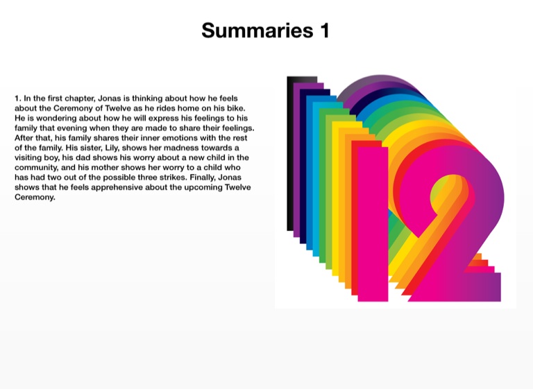 1. In the first chapter, Jonas is thinking about how he feels about the Ceremony of Twelve as he rides home on his bike. He is wondering about how he will express his feelings to his family that evening when they are made to share their feelings. After that, his family shares their inner emotions with the rest of the family. His sister, Lily, shows her madness towards a visiting boy, his dad shows his worry about a new child in the community, and his mother shows her worry to a child who has had two out of the possible three strikes. Finally, Jonas shows that he feels apprehensive about the upcoming Twelve Ceremony.