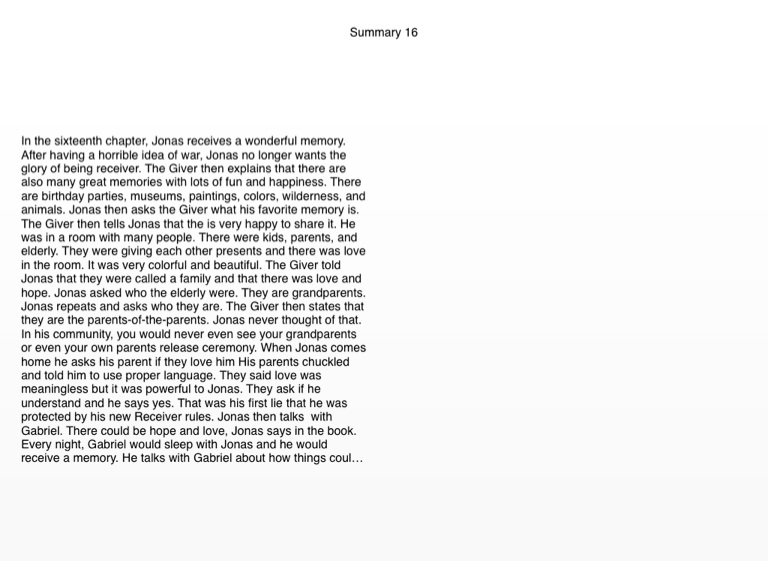 In the sixteenth chapter, Jonas receives a wonderful memory. After having a horrible idea of war, Jonas no longer wants the glory of being receiver. The Giver then explains that there are also many great memories with lots of fun and happiness. There are birthday parties, museums, paintings, colors, wilderness, and animals. Jonas then asks the Giver what his favorite memory is. The Giver then tells Jonas that the is very happy to share it. He was in a room with many people. There were kids, parents, and elderly. They were giving each other presents and there was love in the room. It was very colorful and beautiful. The Giver told Jonas that they were called a family and that there was love and hope. Jonas asked who the elderly were. They are grandparents. Jonas repeats and asks who they are. The Giver then states that they are the parents-of-the-parents. Jonas never thought of that. In his community, you would never even see your grandparents or even your own parents release ceremony. When Jonas comes home he asks his parent if they love him His parents chuckled and told him to use proper language. They said love was meaningless but it was powerful to Jonas. They ask if he understand and he says yes. That was his first lie that he was protected by his new Receiver rules. Jonas then talks with Gabriel. There could be hope and love, Jonas says in the book. Every night, Gabriel would sleep with Jonas and he would receive a memory. He talks with Gabriel about how things could change.