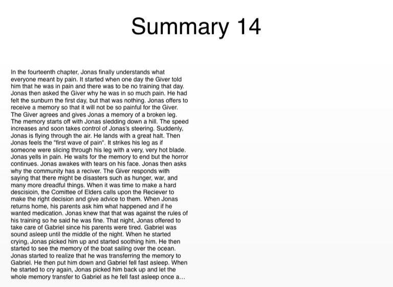In the fourteenth chapter, Jonas finally understands what everyone meant by pain. It started when one day the Giver told him that he was in pain and there was to be no training that day. Jonas then asked the Giver why he was in so much pain. He had felt the sunburn the first day, but that was nothing. Jonas offers to receive a memory so that it will not be so painful for the Giver. The Giver agrees and gives Jonas a memory of a broken leg. The memory starts off with Jonas sledding down a hill. The speed increases and soon takes control of Jonas's steering. Suddenly, Jonas is flying through the air. He lands with a great halt. Then Jonas feels the "first wave of pain". It strikes his leg as if someone were slicing through his leg with a very, very hot blade. Jonas yells in pain. He waits for the memory to end but the horror continues. Jonas awakes with tears on his face. Jonas then asks why the community has a reciver. The Giver responds with saying that there might be disasters such as hunger, war, and many more dreadful things. When it was time to make a hard descisioin, the Comittee of Elders calls upon the Reciever to make the right decision and give advice to them. When Jonas returns home, his parents ask him what happened and if he wanted medication. Jonas knew that that was against the rules of his training so he said he was fine. That night, Jonas offered to take care of Gabriel since his parents were tired. Gabriel was sound asleep until the middle of the night. When he started crying, Jonas picked him up and started soothing him. He then started to see the memory of the boat sailing over the ocean. Jonas started to realize that he was transferring the memory to Gabriel. He then put him down and Gabriel fell fast asleep. When he started to cry again, Jonas picked him back up and let the whole memory transfer to Gabriel as he fell fast asleep once again. Should Jonas tell the Giver?