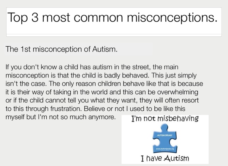If you don't know a child has autism in the street, the main misconception is that the child is badly behaved. This just simply isn't the case. The only reason children behave like that is because it is their way of taking in the world and this can be overwhelming or if the child cannot tell you what they want, they will often resort to this through frustration. Believe or not I used to be like this myself but I'm not so much anymore.