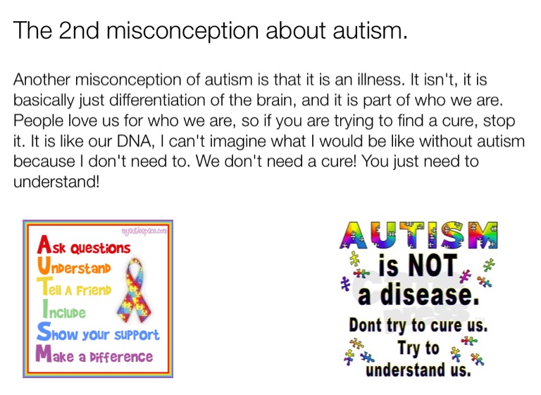Another misconception of autism is that it is an illness. It isn't, it is basically just differentiation of the brain, and it is part of who we are. People love us for who we are, so if you are trying to find a cure, stop it. It is like our DNA, I can't imagine what I would be like without autism because I don't need to. We don't need a cure! You just need to understand!