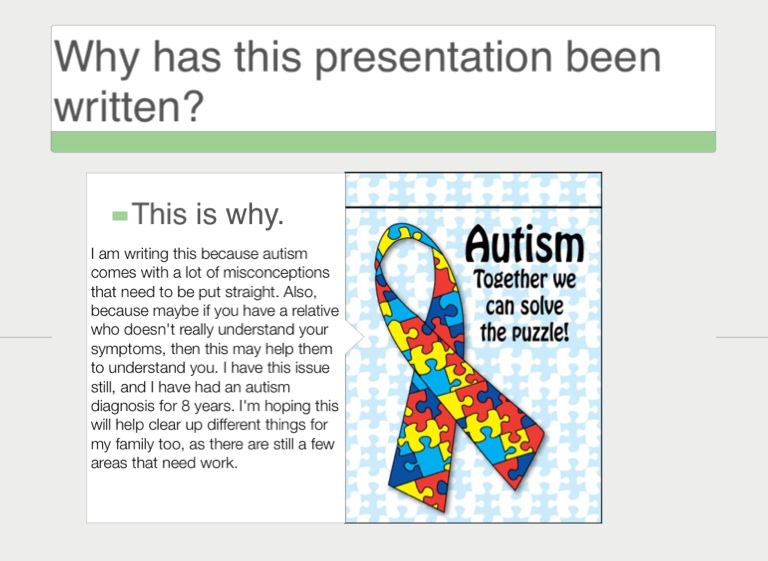 I am writing this because autism comes with a lot of misconceptions that need to be put straight. Also, because maybe if you have a relative who doesn't really understand your symptoms, then this may help them to understand you. I have this issue still, and I have had an autism diagnosis for 8 years. I'm hoping this will help clear up different things for my family too, as there are still a few areas that need work.