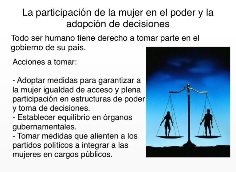 - Adoptar medidas para garantizar a la mujer igualdad de acceso y plena participación en estructuras de poder y toma de decisiones.
