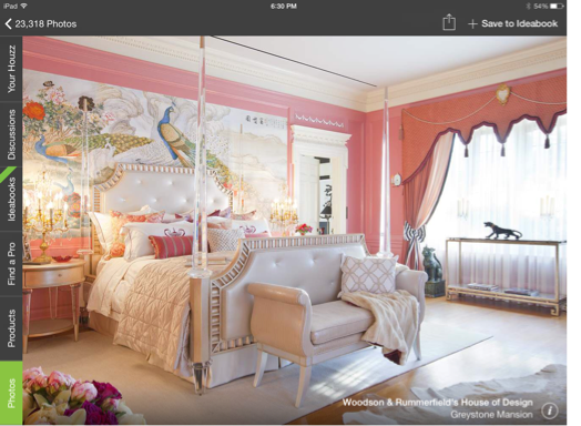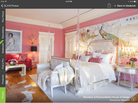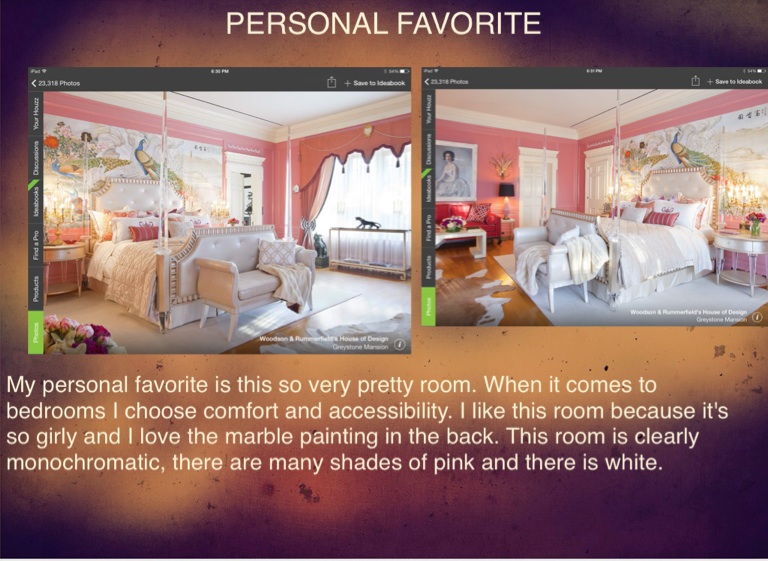 My personal favorite is this so very pretty room. When it comes to bedrooms I choose comfort and accessibility. I like this room because it's so girly and I love the marble painting in the back. This room is clearly monochromatic, there are many shades of pink and there is white.
