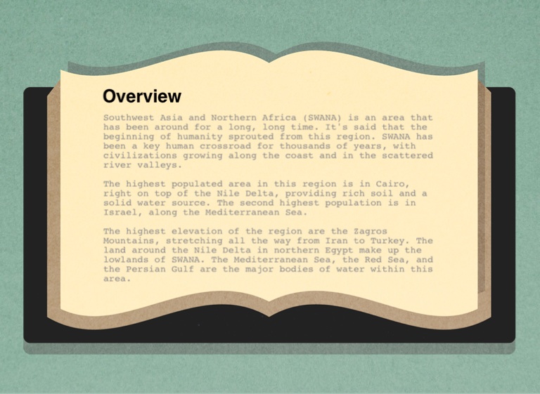 Southwest Asia and Northern Africa (SWANA) is an area that has been around for a long, long time. It's said that the beginning of humanity sprouted from this region. SWANA has been a key human crossroad for thousands of years, with civilizations growing along the coast and in the scattered river valleys.