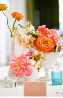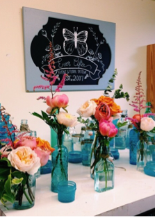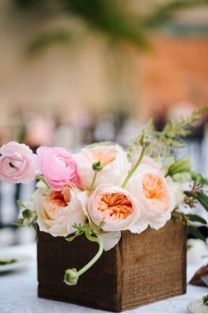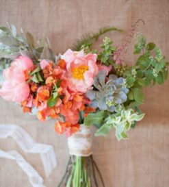 Arrangements will feature a mix of garden flowers and tropical florals such as pin cushion protea, lisianthus, Juliet roses, bougainvillea, blushing bride and other wild flowers. Airplants and succulents along with other foliage will offer an organic vibe. A collection of 2 floral designs will be displayed through out the reception accented by of candle light. One will feature a singular arrangement while the other will feature a grouping of arrangements. Guests will find their place card on a table decorated with a grouping of arrangements. Bridal bouquet will be a round hand tied bouquet romantic style. While bridesmaids bouquets will be hand tied greens and blooms in coordinating tones.