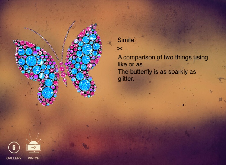 A comparison of two things using like or as. The butterfly is as sparkly as glitter.