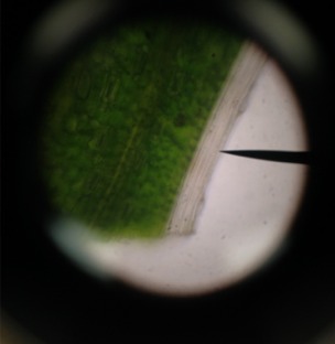 This slide of a grass leaf is slightly different from the rest of the slides because, it shows us a parallel veined leaf. This can be seen on the edge of the image, where you can see a slightly transparent tubular structure,a leaf vein. The image also contains a stoma and some cuticles.