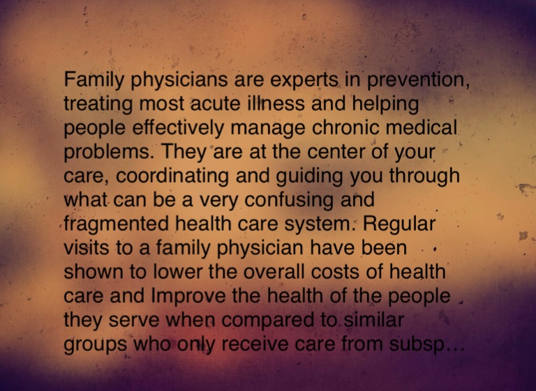 Family physicians are experts in prevention, treating most acute illness and helping people effectively manage chronic medical problems. They are at the center of your care, coordinating and guiding you through what can be a very confusing and fragmented health care system. Regular visits to a family physician have been shown to lower the overall costs of health care and Improve the health of the people they serve when compared to similar groups who only receive care from subspecialists.