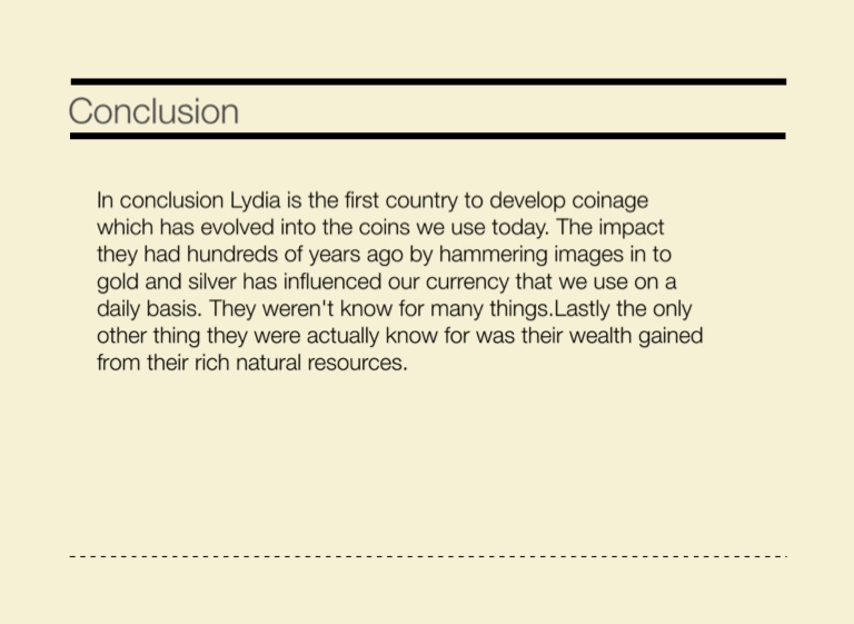 In conclusion Lydia is the first country to develop coinage which has evolved into the coins we use today. The impact they had hundreds of years ago by hammering images in to gold and silver has influenced our currency that we use on a daily basis. They weren't know for many things.Lastly the only other thing they were actually know for was their wealth gained from their rich natural resources.