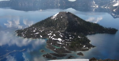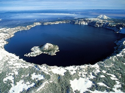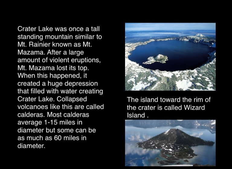 Crater Lake was once a tall standing mountain similar to Mt. Rainier known as Mt. Mazama. After a large amount of violent eruptions, Mt. Mazama lost its top. When this happened, it created a huge depression that filled with water creating Crater Lake. Collapsed volcanoes like this are called calderas. Most calderas average 1-15 miles in diameter but some can be as much as 60 miles in diameter.