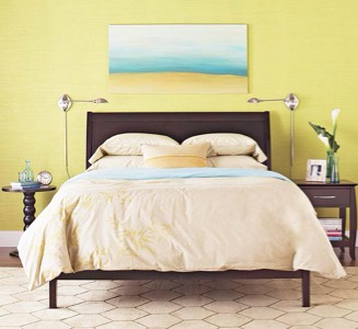 This room is in proportion because the bed is balance out with the artwork and the night stands. The things on the wall are not too big for the bed. The bed is pretty big itself, so the extra pieces of furniture even it out in the room. The relationship of the sizes and color of furniture make the design work.