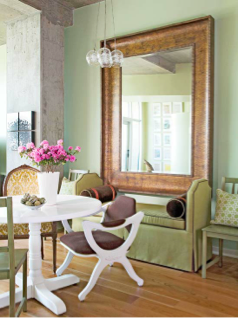 This room shows scale because it has a very large mirror with other small pieces of furniture. The mirror stands out because of its size compared to the other furniture. It covers up the tall wall and balances the room.