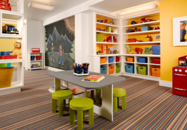 This room is child scale because of the small chairs, tables, and shelves. This furniture is small enough for children to use and the shelves are short enough for children to reach.