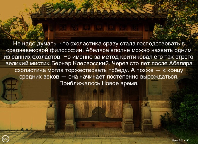 Не надо думать, что схоластика сразу стала господствовать в средневековой философии. Абеляра вполне можно назвать одним из ранних схоластов. Но именно за метод критиковал его так строго великий мистик Бернар Клервосский. Через сто лет после Абеляра схоластика могла торжествовать победу. А позже — к концу средних веков — она начинает постепенно вырождаться. Приближалось Новое время.