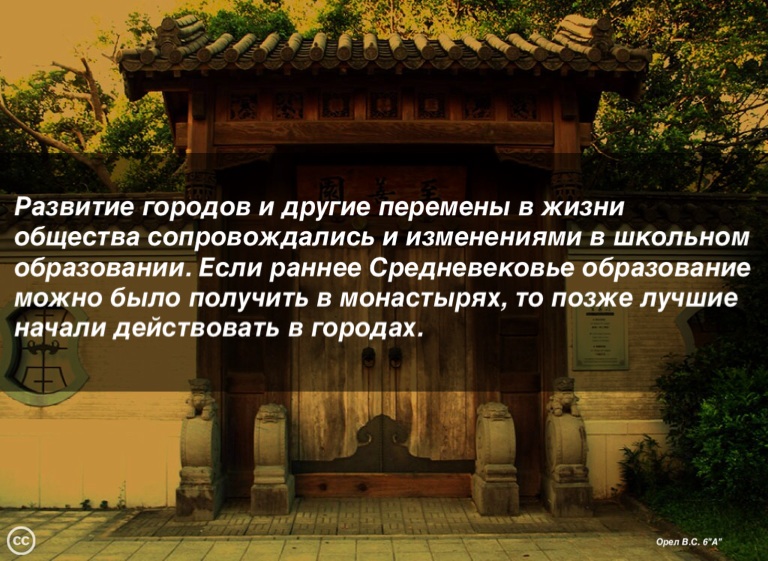 Развитие городов и другие перемены в жизни общества сопровождались и изменениями в школьном образовании. Если раннее Средневековье образование можно было получить в монастырях, то позже лучшие начали действовать в городах.