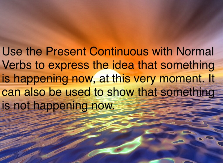 Use the Present Continuous with Normal Verbs to express the idea that something is happening now, at this very moment. It can also be used to show that something is not happening now.