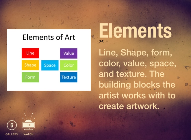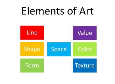Line, Shape, form, color, value, space, and texture. The building blocks the artist works with to create artwork.