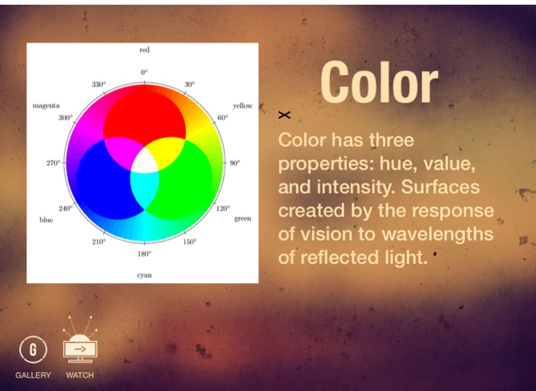 Color has three properties: hue, value, and intensity. Surfaces created by the response of vision to wavelengths of reflected light.