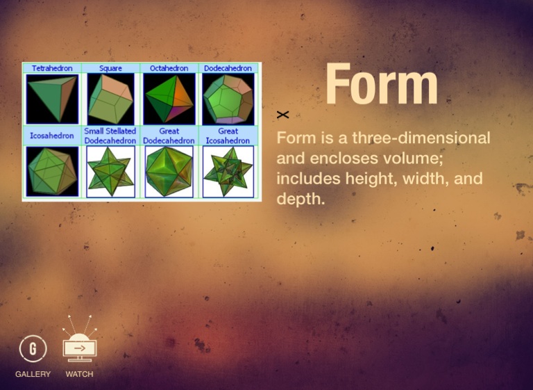 Form is a three-dimensional and encloses volume; includes height, width, and depth.