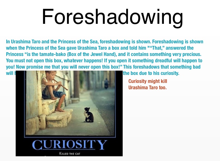 In Urashima Taro and the Princess of the Sea, foreshadowing is shown. Foreshadowing is shown when the Princess of the Sea gave Urashima Taro a box and told him "“That,” answered the Princess “is the tamate-bako (Box of the Jewel Hand), and it contains something very precious. You must not open this box, whatever happens! If you open it something dreadful will happen to you! Now promise me that you will never open this box!” This foreshadows that something bad will happen because Urashima taro will most likely open the box due to his curiosity.