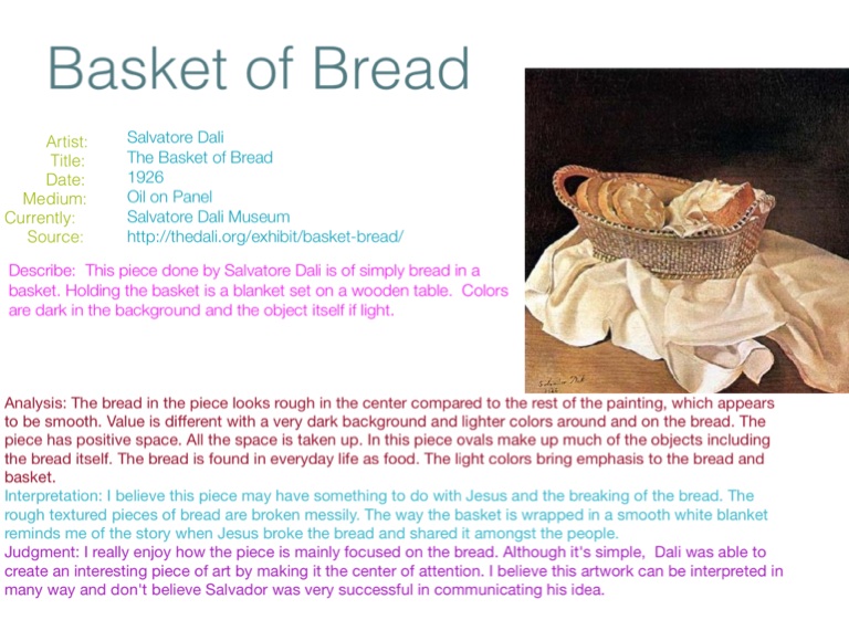 Describe: This piece done by Salvatore Dali is of simply bread in a basket. Holding the basket is a blanket set on a wooden table. Colors are dark in the background and the object itself if light.