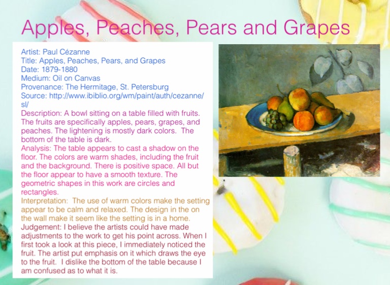 Analysis: The table appears to cast a shadow on the floor. The colors are warm shades, including the fruit and the background. There is positive space. All but the floor appear to have a smooth texture. The geometric shapes in this work are circles and rectangles.
