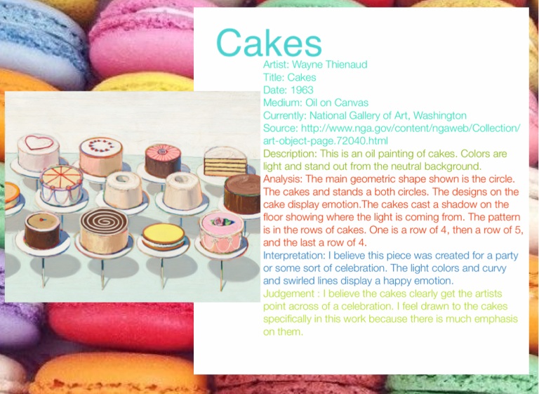 Judgement : I believe the cakes clearly get the artists point across of a celebration. I feel drawn to the cakes specifically in this work because there is much emphasis on them.