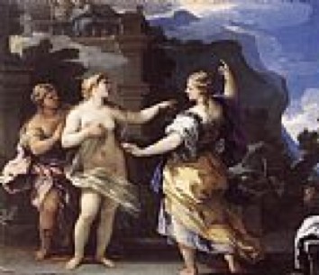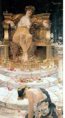 Psyche wandered around looking for her lost love. She ran into Ceres who said she couldn't protect her from Venus and the only thing to do was to become her servant, so she went to become Venus's servant. Venus wanted to ruin Psyche's life, well what was left of it. She was getting revenge for all the worship Psyche was getting and for burning her son with hot candle wax. Cupid was up in the tower recovering from his burn. Venus first made Psyche sort all the grain before the end of the day. Cupid sent the leader ant of the anthill who helped her grain by grain. Venus was outraged that Cupid helped her and she didn't do the work. The next day she made Psyche collect the Golden fleeces of the sheep by the river. On her way there she saw a reed that spoke to her and told her to wait until noon time when the sheep go into the shade and the wool will stick to the bushes and trunks of the trees. So she did this and returned to Venus who claimed she had help and didn't do it herself.